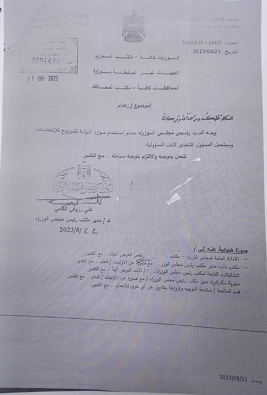 أصدر رئيس الحكومة محمد شياع السوداني توجيهًا رسميًا لمنع المحافظين والوزراء والجهات الحكومية من استغلال موارد الدولة لكسب الأصوات الانتخابية. يتعهد المخالفين بعقوبات مناسبة.