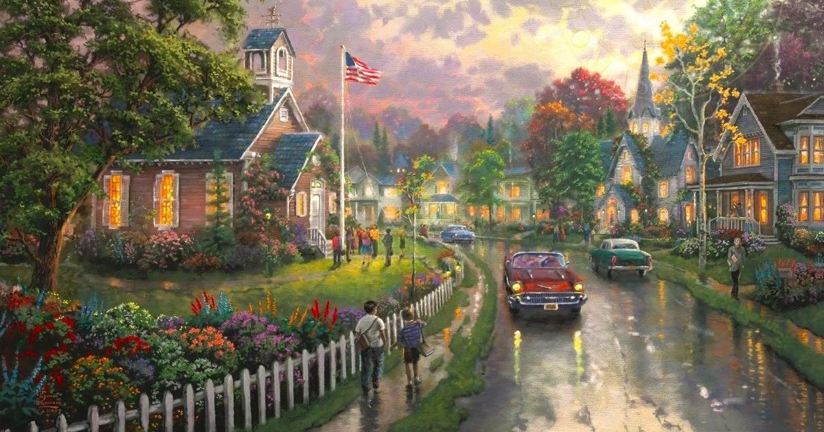 اللوحة أثارت جدلاً على مواقع التواصل الاجتماعي، وهي تجسّد مشهداً مثالياً يعود إلى منتصف القرن العشرين، حيث تسير سيارات قديمة في شوارع بلدة صغيرة، مروراً بمدرسة قديمة الطراز، يرفرف العلم الأميركي في ساحتها.