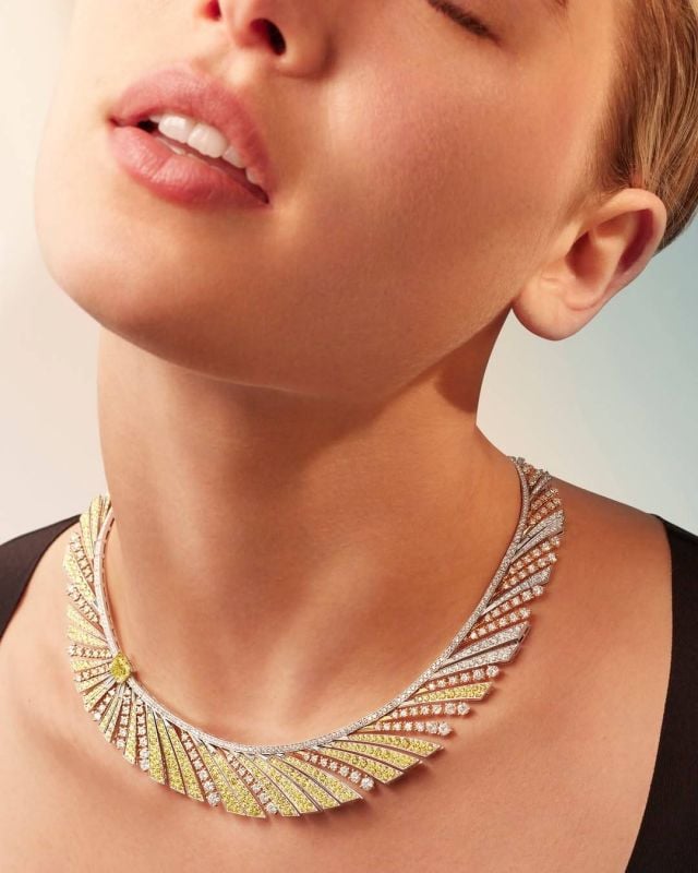 أما المجموعة الثانية فتستلهم سحر حجر الألماس الأصفر Soleil d’Or، الذي اكتشفته الدار عام 1977. بلمسة عصرية مرنة، تمزج القطع بين الذهب الأبيض والأصفر، وأحجار الألماس بدرجاتها اللامعة، لتعكس وهج الشمس في لحظات الشروق والذروة، بتصاميم يمكن ارتداؤها بطرق متعدّدة.