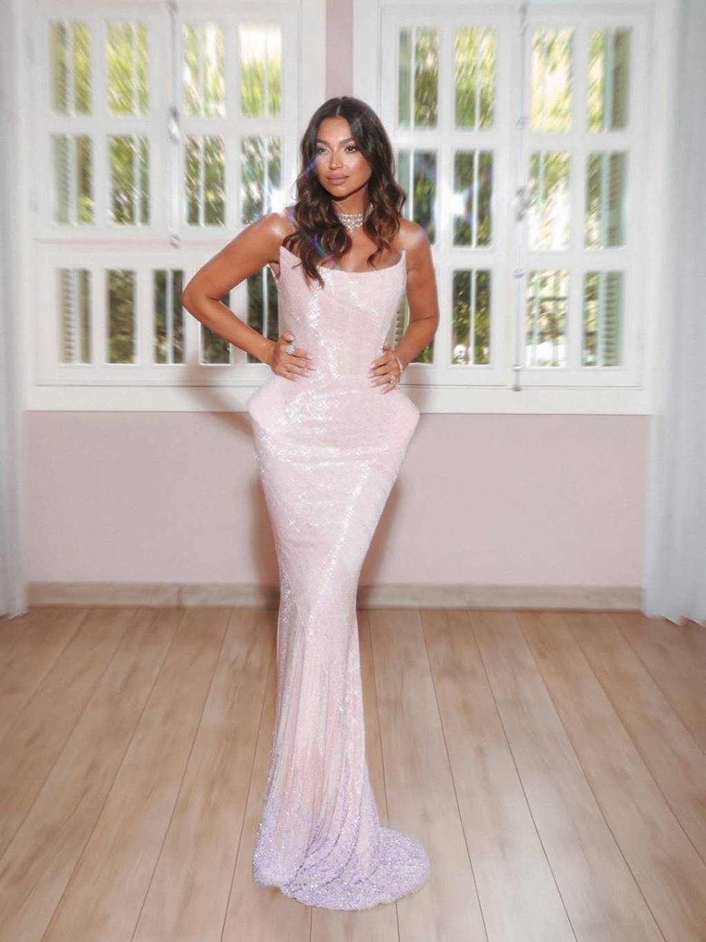 مشت الممثلة رنين مطر على السجادة الحمراء بفستان فخم باللون الزهري الزاهي حمل توقيع المصمّمة سارة مراد، تميّز بقماشه اللامع وبتصميمه المجسّم الذي يبرز رشاقتها، وجاء من دون أكمام مع حواف مسنّنة عند منطقة الصدر وبتصميم الكورسيه الضيق الذي يمدح رشاقتها، وانسدل بتنورة طويلة وضيّقة وبقصّة هيكلية بارزة عند الخصر، وهو ما أضاف لمسة من الفخامة الى الفستان الأنيق.