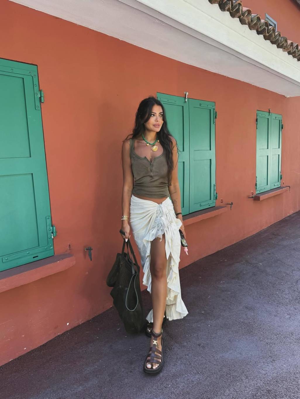 تميزت إطلالة العنود بدر بتانك توب باللون الزيتي الداكن مع أزرار تحت الياقة، ونسّقت مع تنورة بيضاء طويلة وفضفاضة على الطريقة الغجرية. أكملت إطلالتها بصندل جلدي باللون البني وحقيبة كبيرة الحجم بلون زيتي متناسق مع التوب.