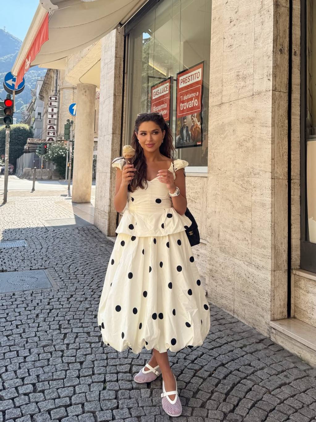 وبعد إطلالاتها الأنيقة في الحفلات الخاصة بزفاف صديقتها “الدكتورة يومي”، تكمل الفاشينيستا الكويتية عطلتها الصيفية مع ابنتها دانة في إيطاليا، واختارت في أحدث إطلالة لها فستاناً ناعماً أبيض اللون بتصميم عصري ويعتمد على صيحة الـPolka Dot، التي تعتبر من أهم صيحات الخريف المقبل.