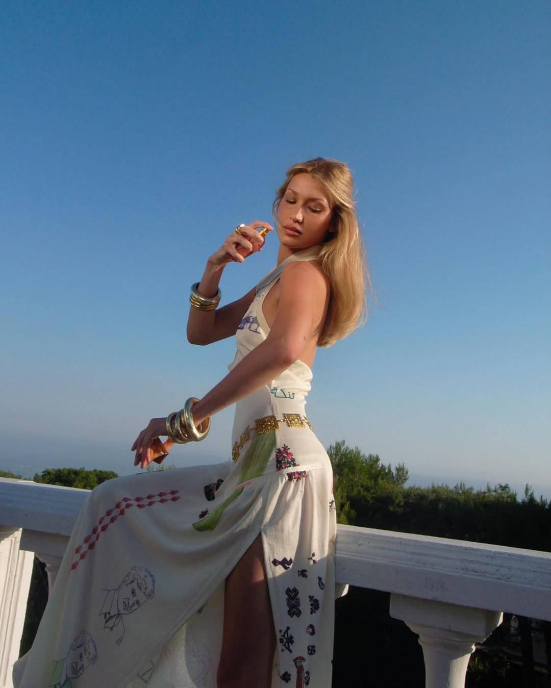 ارتدت حديد هذا الفستان بمناسبة إطلاق أحدث عطور “أوريبيلا” بعنوان “الجذور الخالدة”. يُجسد العطر الجديد، وفقاً لحديد، التمسك بأصولنا عندما يُصعّب العالم الأمر علينا.