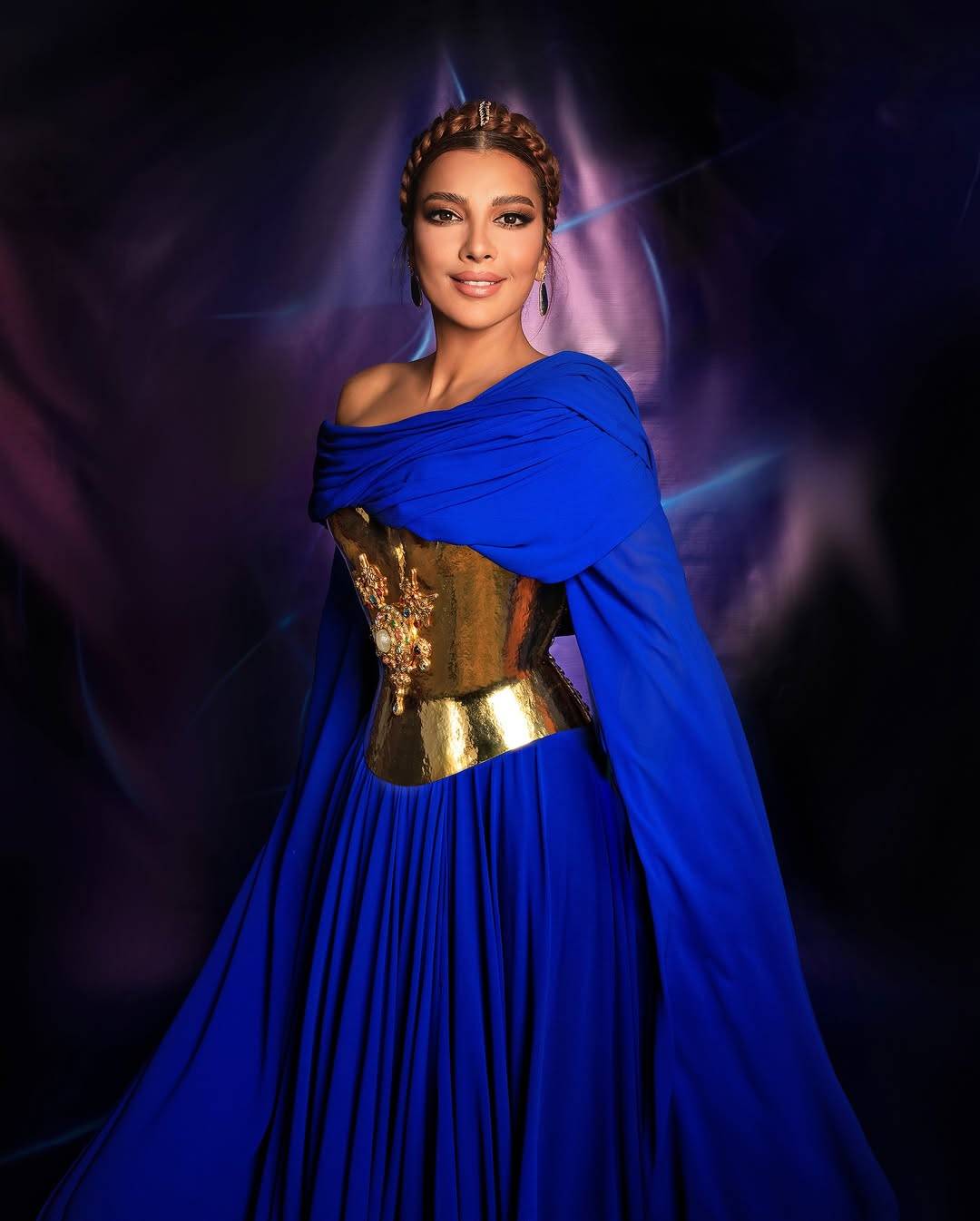 تألقت النجمة أصالة نصري خلال حفلها في بيروت بإطلالة مميزة مستوحاة من الطابع الإغريقي باللون الأزرق الملكي الفخم. اختارت النجمة السورية فستاناً أنيقاً يحمل توقيع المصمّم اللبناني كريكور جابوتيان، تميّز بقصّة الأكتاف المنسدلة مع قماش متطاير على شكل أكمام طويلة تصل الى حدود الأرض، وينسدل من الأسفل بتنورة واسعة بطبقات انسيابية من القماش، وأضيفت إلى التصميم حركة الكورسيه المعدني المزيّن بالورود باللون الذهبي الذي ينحت خصرها بشكل بارز.