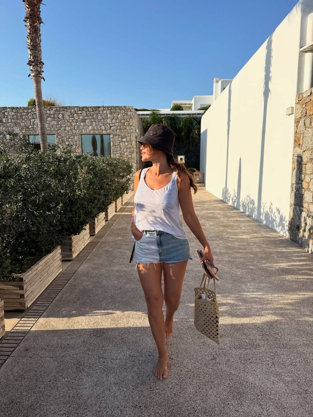 في إحدى الإطلالات، ظهرت جيهان مرتدية "توب تانك" بيضاء شفافة مع سروال قصير "هوت شورت" من قماش الدينم، حيث تميز السروال بنصف أزرق ونصف أبيض. completes هذا التنسيق مع سيرتها حافية القدمين وحملها للشبشب بيدها إلى جانب حقيبة يد باللون البيج. هذا الخيار يعكس جريئة موضة الصيف التي تتميز بالراحة والأناقة في الوقت نفسه.