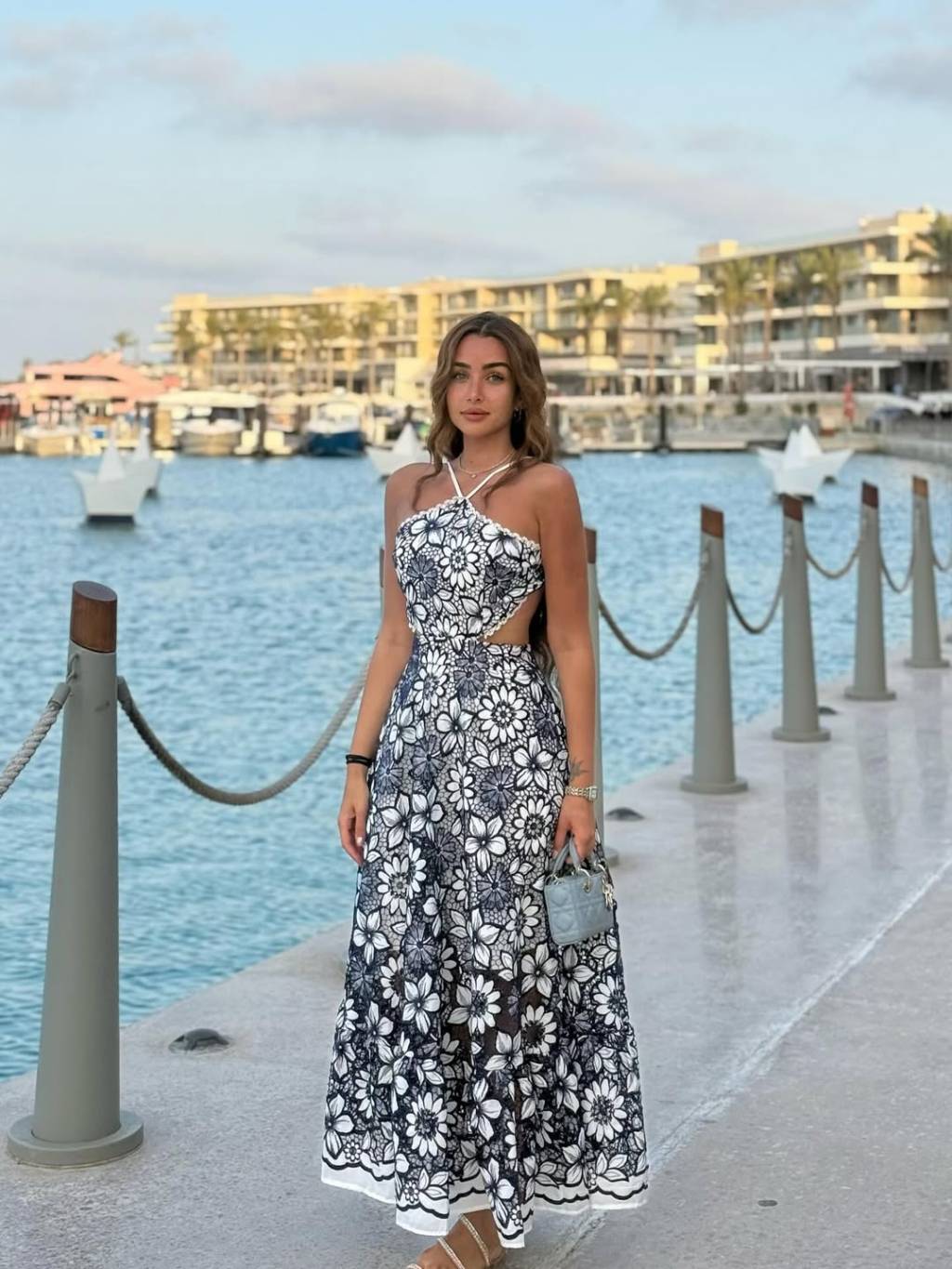 جاء الفستان بطابع صيفي أنيق، بقصّة فضفاضة وطويلة تتيح الانسيابية والراحة في الحركة، ما يجعله خياراً مثالياً لأجواء الصيف الحارة. وقد طُبعت عليه نقوش بارزة من الورود بتدرّجات اللونين الكحلي والأبيض، ما أضفى عليه لمسة من النعومة والرومانسية الراقية، من دون أن يفقد هويته العصرية.