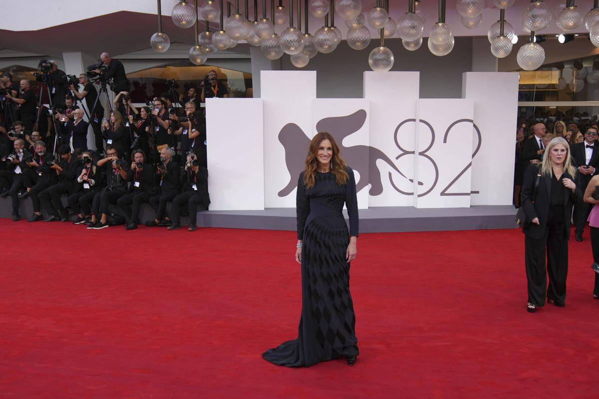 حضرت النجمة جوليا روبرتس العرض الأول لفيلمها الجديد “بعد الصيد” على السجادة الحمراء، وارتدت فستاناً أسود من تصميم دار أتيلييه فيرساتشي، من تصميم المدير الإبداعي الجديد للدار الإيطالية داريو فيتالي. ويتكون التصميم من قماش الكريب البحري، ويتميز بزخارف دامييه مصنوعة يدويا ومطرزة بخيط حرير أسود، في إطلالة كلاسيكية مميزة.