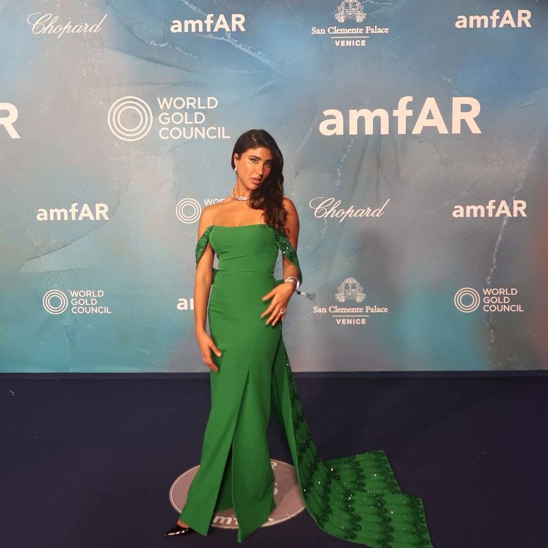 تألقت ليلى عبد الله كذلك بفستان باللون الأزرق النيلي خلال رحلة لها بالقارب في البندقية الساحرة. اختارت فستاناً مميزاً بتصميم ضيق بالكامل مع حمالات عريضة، وتميز بقصة الثنيات الرقيقة التي زينت القماش. لينسدل بتنورة واسعة من الأسفل مع فتحة جانبية واسعة عند الساق. أكملت إطلالتها بحذاء نسائي باللون الأحمر، وتزينت بمجوهرات رقيقة عبارة عن قلادة ماسية عريضة. لفتت الأنظار بتسريحة شعرها الريترو المميزة ومكياج قوي وهايلايتر بارز.