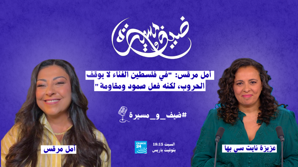 حاورت الإعلامية عزيزا نايت سي الفنانة الفلسطينية أمل مرقس في برنامج "ضيف ومسيرة" على قناة فرانس 24. أمل مرقس انضمت إلى البرنامج من فلسطين عبر الأقمار الصناعية. في هذا الحوار المطول، تتقاطع سيرة الفنانة الشخصية مع تاريخ شعب فلسطين الذي عاش النكبة وتوالي الحروب وموجات القمع.