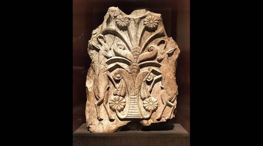 النقش مصنوع من الحجر الجيري، ويعد جزءاً من قطعة أكبر ربما كانت تزين أحد المباني في مدينة القصر الملكي بالملقطة. يظهر النقش غزالين يقفان على قوائمهما الخلفية، يأكلان من نخلة مزينة.