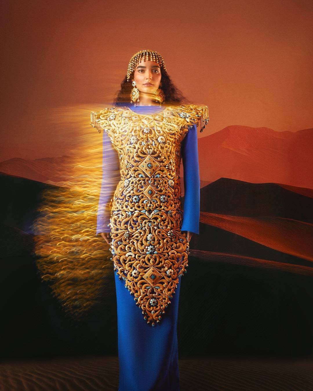 يعتبر التصميم المميز أغلى فستان في العالم ومصنوع من الذهب الخالص، وتم تصنيعه يدوياً من ذهب عيار 21 قيراطاً، ويزن 8,810.5 غرام من الذهب الصلب. يتضمن الفستان تاجاً ذهبياً مزينا بالأحجار بتصميم أنيق مع أقراط ضخمة متدلية ومزينة بأحجار باللون الأزرق الفيروزي بتصميم مميز.