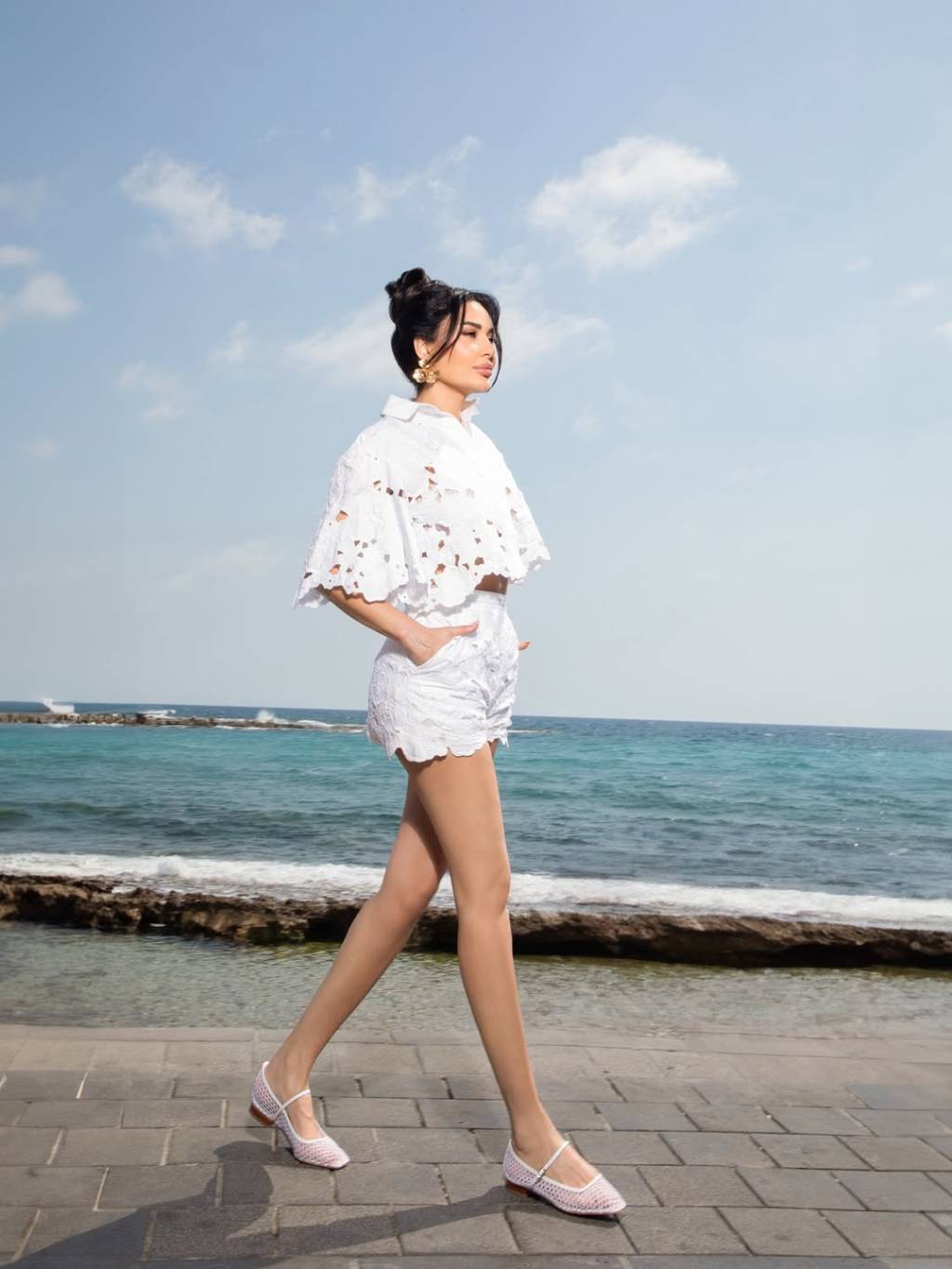 أثارت النجمة سيرين عبد النور الاهتمام بأحدث إطلالاتها على شبكات التواصل الاجتماعي، حيث اختارت مجموعة كاملة باللون الأبيض من تنسيق الستايلست جورج شمعون. هذه المجموعة تضمنت “توب” قصيرة وسروال قصير (شورت) من توقيع المصمّم طوني ورد، وتم نسيقهما مع حذاء باليه مسطّح وشبكي من توقيع أندريا وازن. المجموعة تمتاز بالفُتحات غير المتماثلة في القطعتين الفضفاضتين، إلى جانب التطريز البارز باللون الأبيض نفسه.