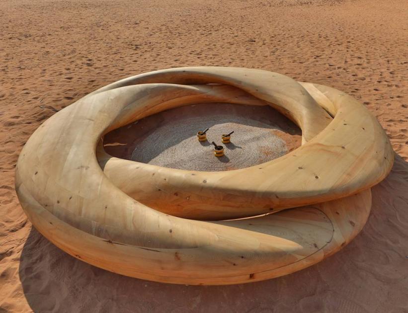 ويحتضن الشاطئ أيضاً مقعداً خشبياً من تصميم المعماري السوري أحمد قَطّان بعنوان «لامُتناهْ: مجلس لانهائي»، الذي يعيد تقديم المجلس الإماراتي التقليدي برؤية معاصرة مستوحاة من شريط «موبيوس» اللانهائي، ليصبح مساحة للحوار والتواصل عبر الأجيال.