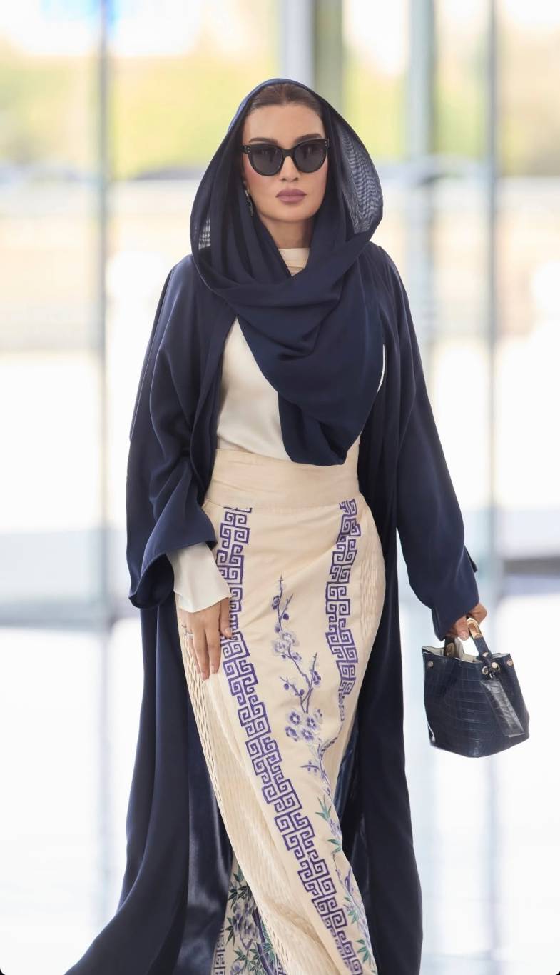 وفي إطلالة أخرى، اختارت اللونين الأبيض والكحلي، وتألقت بطقم أنيق عبارة عن توب بيضاء بسيطة مع تنورة طويلة وواسعة بتطريزات ناعمة على شكل سنابل بخيوط من اللون الكحلي، ونسّقت معهما عباءة أنيقة بقماش خفيف وبتصميم كلاسيكي وعملي فخم. وأضافت وشاحاً ناعماً، وأكملت إطلالتها بحقيبة يد من الجلد متوسطة الحجم باللون الكحلي، وانتعلت حذاء نسائياً أبيض اللون.