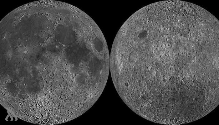 الجانب البعيد: قشرة أكثر سمكا، تضاريس جبلية، عدد أكبر من الفوهات الصدمية، وأحواض أقل امتلاء بالحمم.