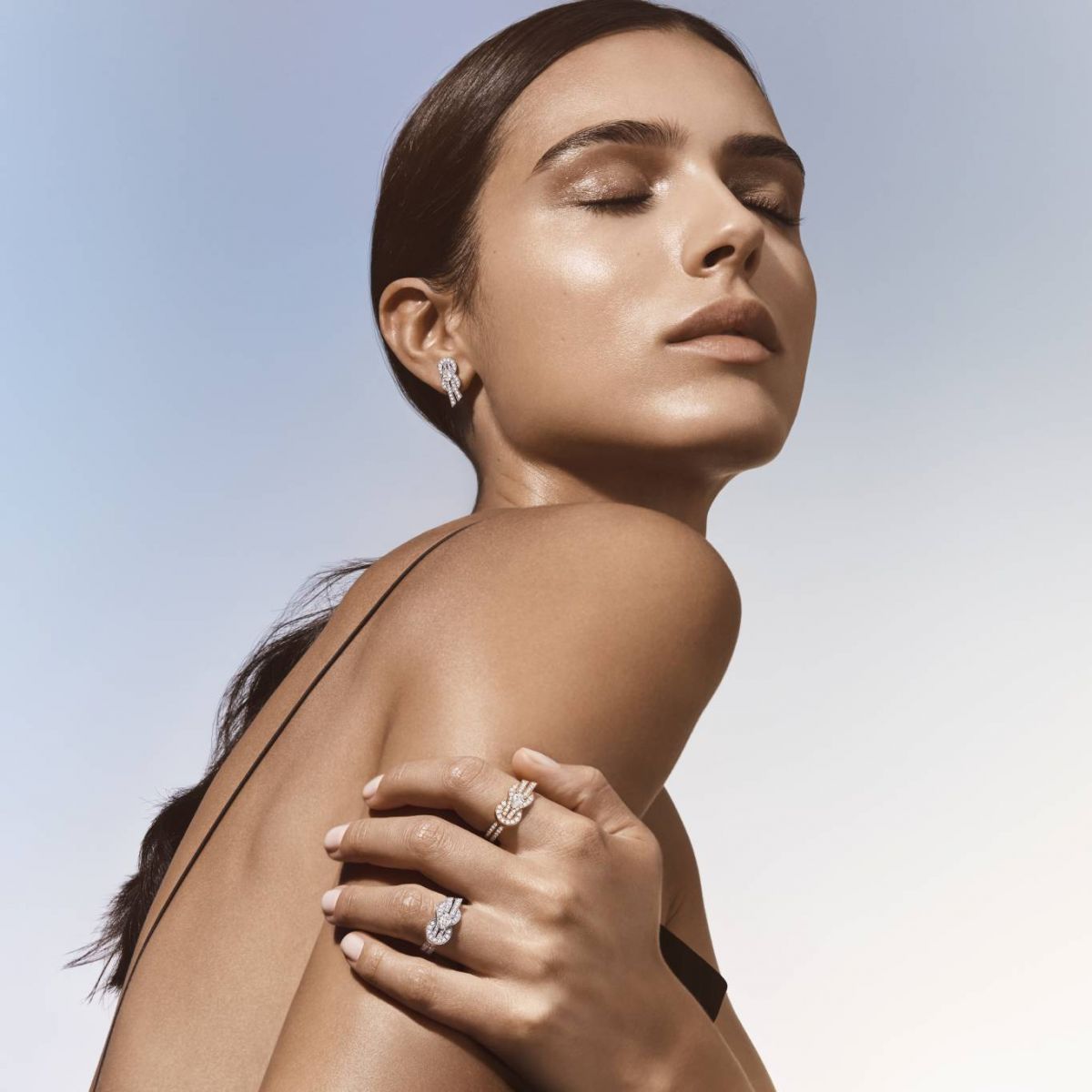 مجموعة المجوهرات الراقية من Chance Infinie صُنعت من الذهب الأبيض ورُصّعت بأحجار الألماس المتراصّ. المجموعة تضمّ قلادة تشوكر وخاتماً يتوسّط كلّ منهما حجر ألماس على شكل كمثرى بوزن 0.7 قيراط. كما تضمّ المجموعة زوجاً من الأقراط، تتدلّى منه شرائط ناعمة تنساب بخفّة وتلامس البشرة برقة مع كل حركة.