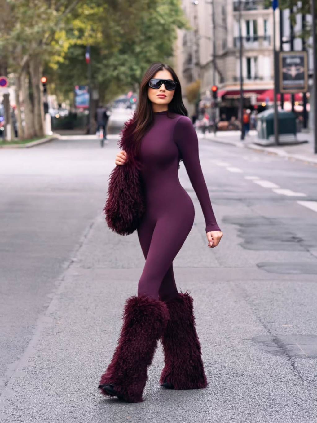 نسّقت مي عمر مع الجمبسوت اللافت بوط طويلاً من اللون نفسه بصيحة الفرو الكثيف الذي يغطي نصف قدمها، وحملت حقيبة كبيرة الحجم من نفس اللون ومن الفرو أيضاً، في تنسيق جريء يظهر اهتمامها بعالم الموضة ومتابعتها لأحدث الصيحات من أهم دور الأزياء العالمية.