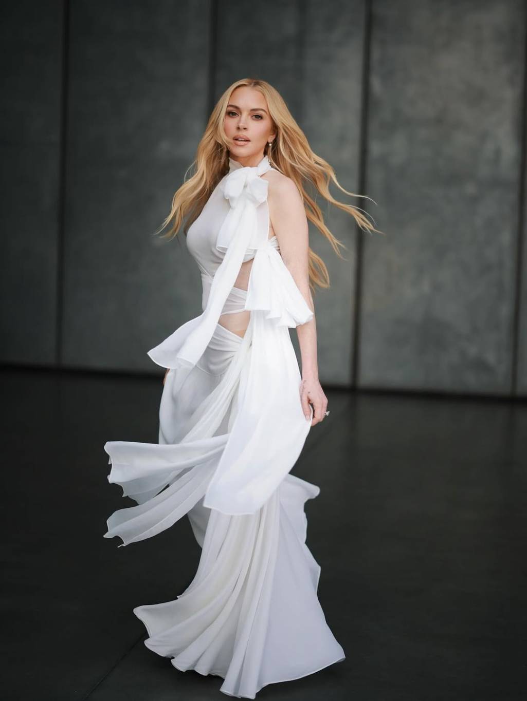 أبهرت الممثلة الأميركية ليندسي لوهان، البالغة من العمر 39 عاماً، معجبيها على منصة "إنستغرام"، حيث ظهرت في صور جديدة ترتدي فستاناً أبيض رائعاً. الفستان البيض كان له بياقة عالية مربوطة على شكل "فيونكة" وفُتحتين على الجانب الأيسر، مما أضفى عليها لمسة أنيقة وجميلة.
