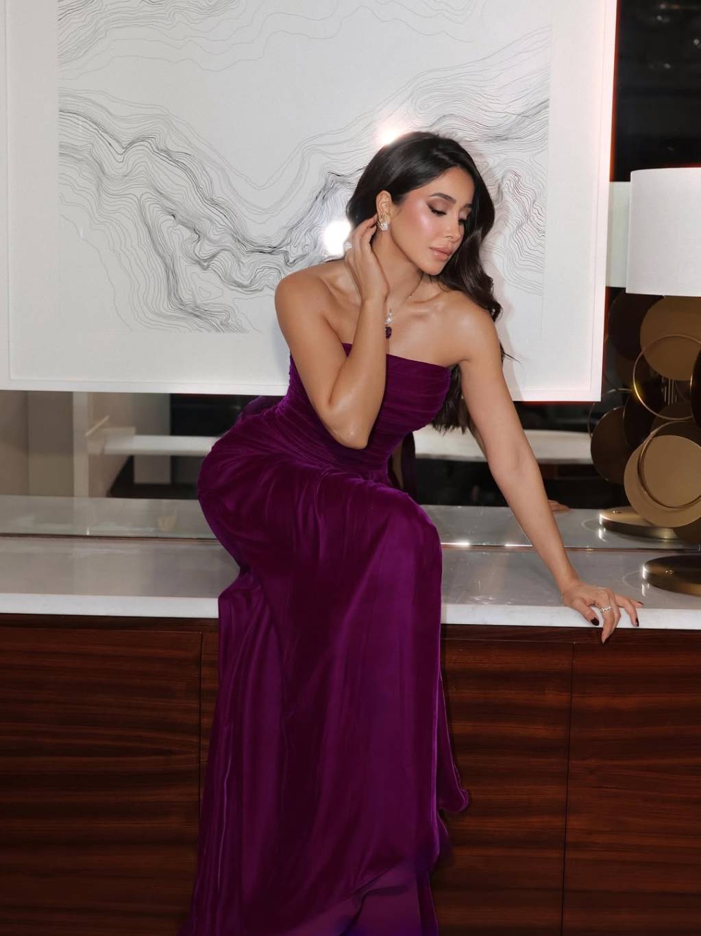 لفتت النجمة السعودية أسيل عمران الأنظار أخيراً بإطلالة أنيقة وغاية في الرقي، حيث اختارت فستاناً باللون البورغندي بتوقيع شربل كرم كوتور. تميّز التصميم بطابع “سترابلس” يكشف عن الأكتاف بأسلوب أنثوي جذّاب، وبقصّته الطويلة والضيّقة التي أبرزت قوامها برقيّ وأناقة لافتة.