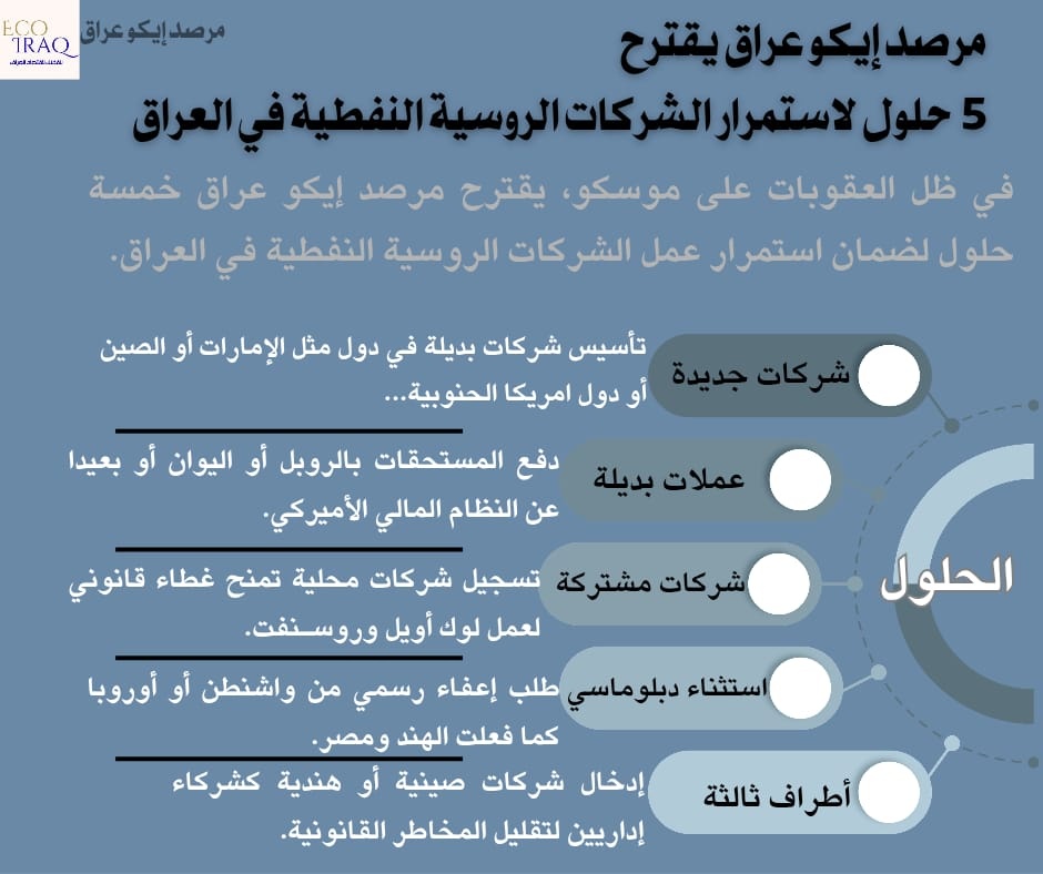 وبين أن "الحل الثاني يتضمن التسوية المالية خارج النظام المالي الأمريكي، وذلك بتسديد المستحقات للشركات الروسية بعملات بديلة عن الدولار، مثل الروبل أو اليوان، عبر بنوك لا تخضع للرقابة الأمريكية، أما الحل الثالث فيتمثل في توفير غطاء قانوني محلي عبر تأسيس شركات خدمية عراقية–روسية مشتركة تسجل داخل العراق، بحيث تواصل الشركات الروسية عملها كمزود تقني وخبير فقط".
