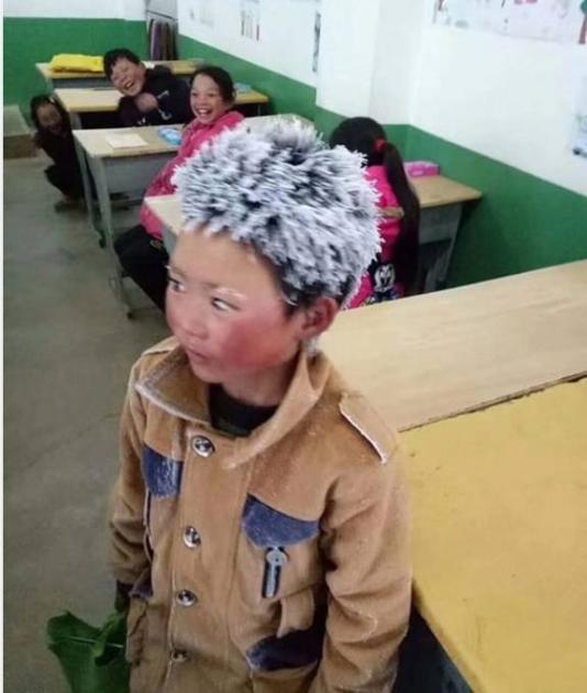 عند دخوله الصف، عم الصمت بين زملائه لثوانٍ، إذ كان شعره وحاجباه ورموشه مغطاة بطبقة من الثلج، فيما التقط المعلم صورة للطفل وهو يبتسم بخجل. انتشرت الصورة على الإنترنت، وأطلق عليه الصينيون لقب «الطفل الجليدي»، لتتضاعف التبرعات خلال أيام إلى 450 ألف دولار لتدفئة المدرسة.