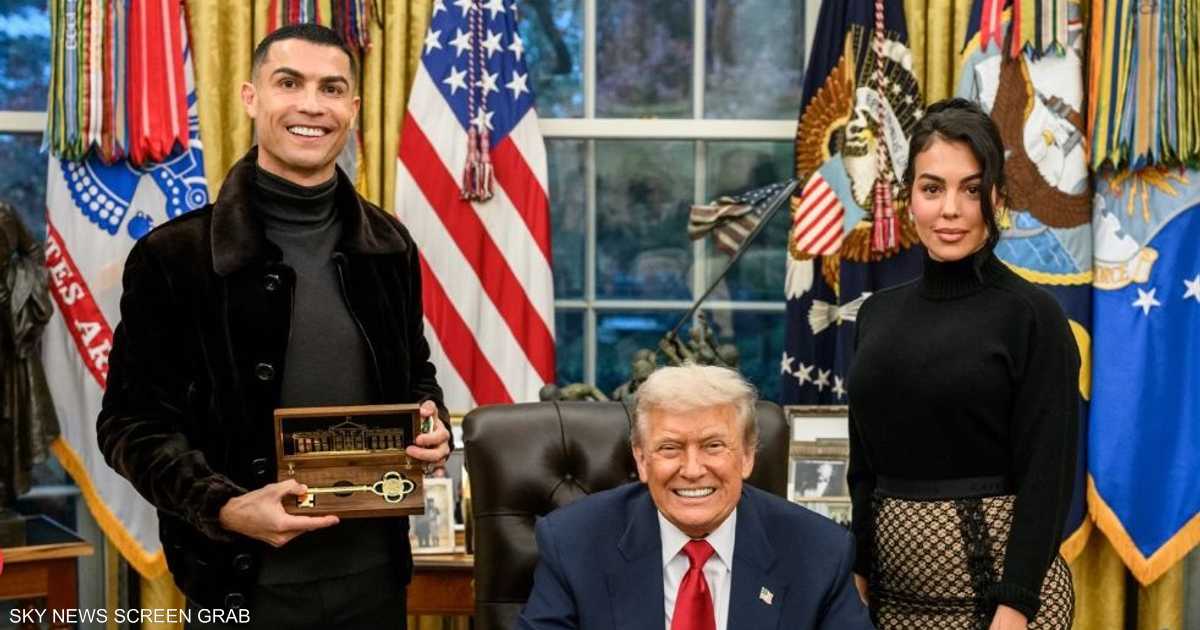 ونشر رونالدو صورا توثق لحظة تسلمه للمفتاح من ترامب رفقة خطيبته جورجينا، شكر النجم البرتغالي رئيس الولايات المتحدة على استقباله في البيت الأبيض.