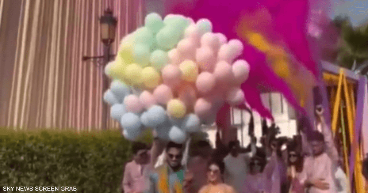 وأظهر مقطع فيديو منتشر على مواقع التواصل الاجتماعي الزوجين وهما يسيران محاطين ببالونات مملوءة بالهيدروجين.