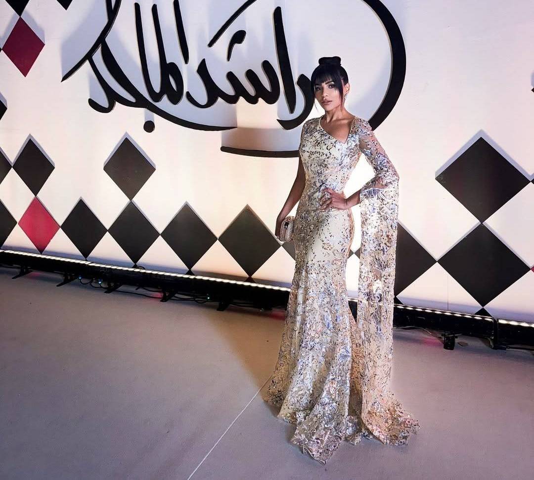 مهيرة عبد العزيز تلفت الأنظار بفستان ذهبي مطرز