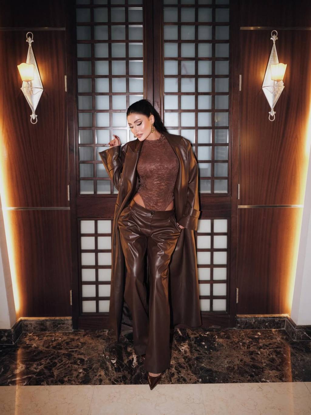 نسّقت هبة نور البودي مع معطف طويل وبنطلون من الجلد باللون البني، ما أضفى على الإطلالة طابعاً عصرياً وقوياً. هذا التناغم بين نعومة الدانتيل وقساوة الجلد منح اللوك توازناً لافتاً، وجعل الإطلالة متكاملة من حيث الخامات والأسلوب.