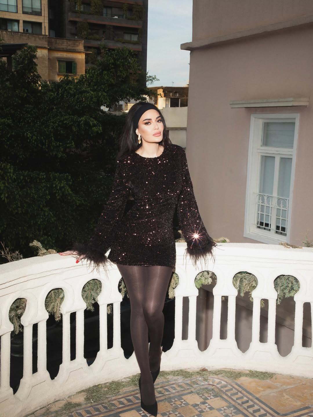 اختارت النجمة اللبنانية فستاناً شتوياً بتصميم قصير وجذّاب، وقد غطّاه البرق الملوّن المتلألئ. وتميّز الثوب بقصة ضيّقة وجريئة وبتصميم مجسّم مع قبة دائرية وأكمام طويلة مزيّنة أطرافها بالريش الفخم، في تباين لافت بين الخامة الشتوية السميكة واللمسات العصرية الأنيقة.