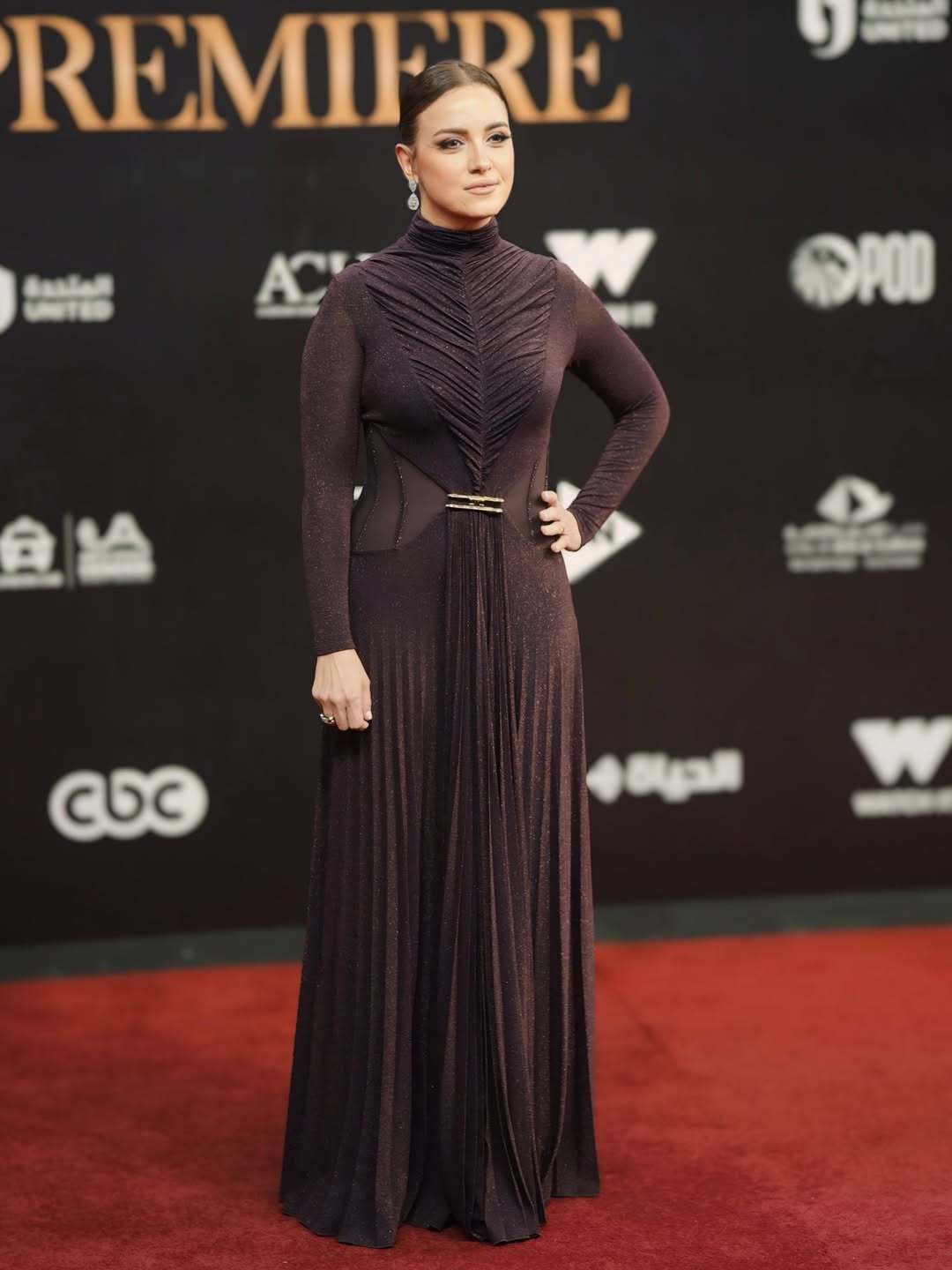 ظهرت ريهام عبد الغفور بإطلالة لافتة باللون البني، حيث اختارت فستانًا يتميز بياقة عالية وقصة ضيقة، مع زمزمات بارزة عند منطقة الصدر أضافت لمسة أنثوية جذابة. كما تميز الفستان بتفاصيل شفافة عند الخصر، وانسدال ناعم منح الإطلالة توازنًا جميلًا بين الجرأة والرقي.