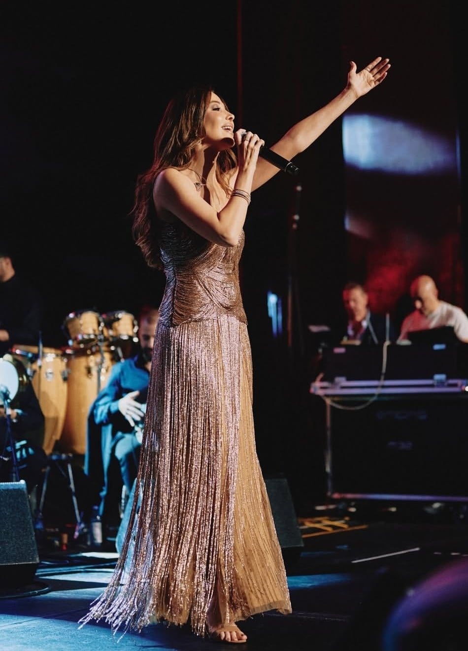 تألقت النجمة اللبنانية بفستان ذهبي من توقيع المصمم اللبناني- العالمي إيلي صعب، وتميّز بصيحة الشراريب الأنيقة والمناسبة للأجواء الاستعراضية، وجاء بحمّالات رفيعة مع فُتحة جريئة عند الصدر وبتصميم مجسم باللون البيج ومطرّز بالكامل بسلاسل من الخرز باللون الذهبي التي تم تصميمها بطريقة هندسية ناعمة عند البطن والورك، وينسدل من الأسفل بفُتحات واسعة عند الساقين على شكل تنورة من الشراريب الجذابة والبراقة.