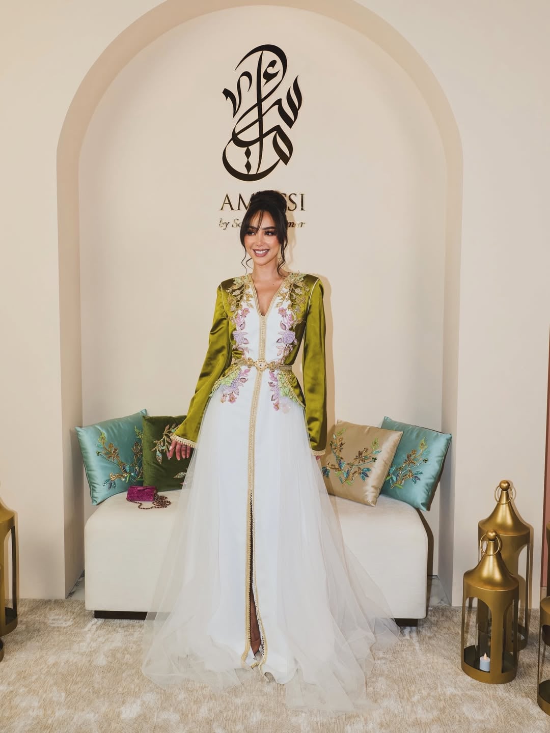 وتألقت الفنانة المغربية بقفطان مبهر باللون الأبيض، يجمع بين التفاصيل التقليدية من التطريزات والشك بالخرز الملوّن والتصميم العصري الذي أضاف لمسة من الفخامة والجمال الى الفستان الأنيق. وجاء الفستان بتصميم ضيّق من الأعلى مع فُتحة V عميقة وبأكمام طويلة باللون الزيتي في مزيج رائع مع الأبيض، وتميّز بحركة الشك بالخرز على شكل ورود باللون الزهري، والتطريزات الذهبية اللافتة والتي منحت الإطلالة المزيد من الفخامة والجمال.