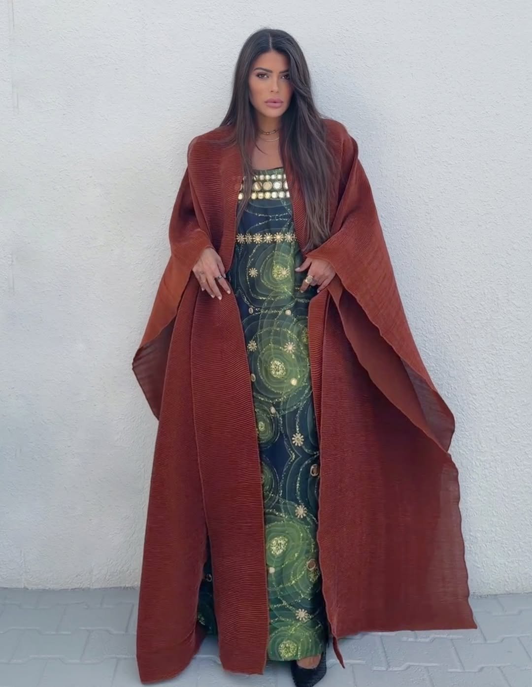 اختارت العنود بدر إطلالة تجمع بين البساطة والأناقة، حيث تألقت بعباءة باللون البنّي البرتقالي، جاءت بقصة واسعة مع أكمام كبيرة. ونسّقت تحتها قطعة باللونين الأزرق والأخضر مع تفاصيل ذهبية لافتة، ما خلق تناغماً جذاباً بين الدرجات الترابية واللمسات المضيئة، ليعكس التصميم طابعاً شرقياً عصرياً يناسب أجواء رمضان.