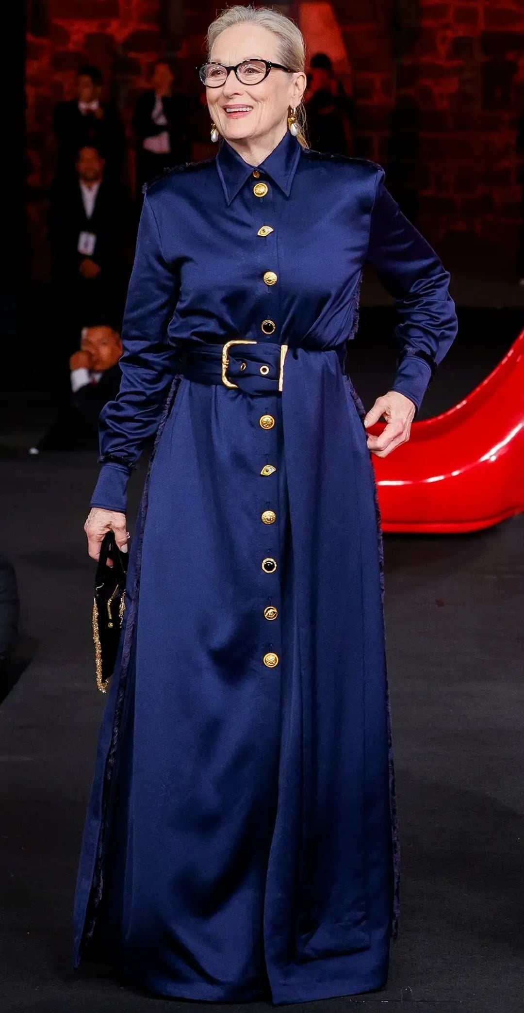 تألقت ستريب في الإطلالة الأولى بإطلالة مونوكرومية باللون الأحمر القرمزي مستوحاة من شخصية “ميرندا بريستلي” التي تقدّمها في الفيلم، عبارة عن طقم كلاسيكي أحادي اللون، يتألف من قميص حريري ناعم مع ربطة عنق Pussy-Bow أنثوية ناعمة، ونسّقت معه بليزر حمراء رسمية بجيوب وبنطال واسع الساقين.