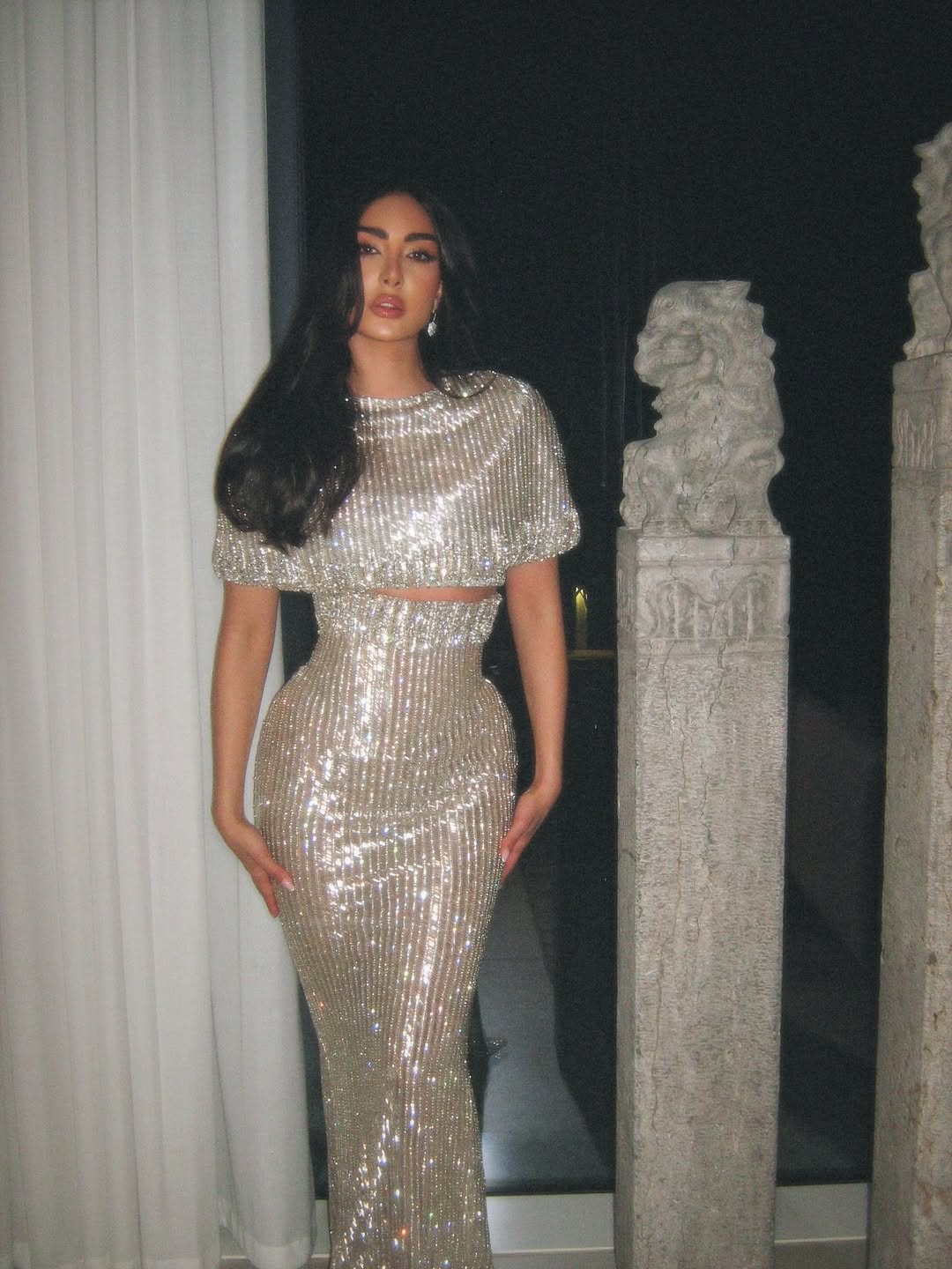 وتألقت النجمة المصرية بفستان عصري أنيق من قطعتين من الأعلى بصدرية مزينة بالترتر والأحجار، وجاء فوقها “كاب” عند الكتفين بأكمام قصيرة، مع حركة عصرية تكشف عن جسمها عند منطقة الصدر وتصميم كورسيه ضيق من الأعلى ومزين بالترتر والأحجار اللامعة، وينسدل من الأسفل بتصميم طويل ومجسم بالكامل يبرز قوامها الممشوق ورشاقتها مع فتحة عالية عند الساق من الخلف.