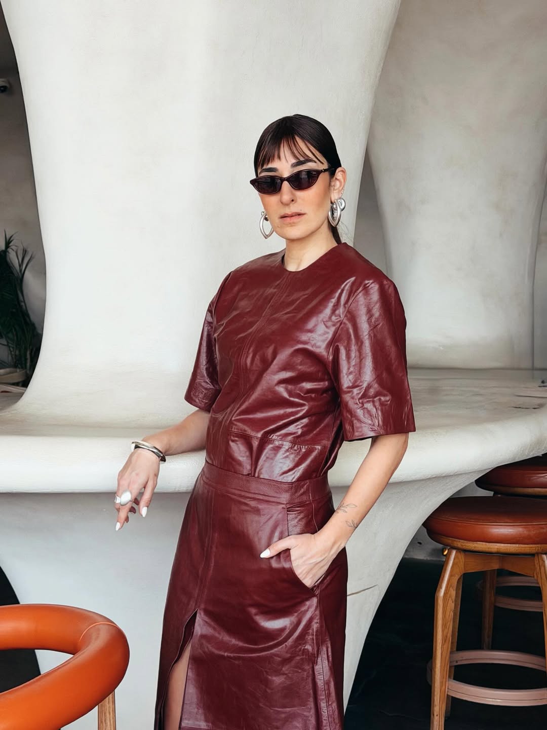 في لوك آخر من العلامة نفسها، اختارت أمينة خليل فستاناً ميدي من الجلد الأحمر، تميز بفتحة وسطية أضفت لمسة جريئة وأنثوية في آن واحد. التصميم جاء بسيطاً في قصّته لكنه لافت بخامته ولونه، ما جعله محور الإطلالة. ونسّقته مع حذاء Mules من الجلد الأسود، إلى جانب نظارات شمسية بارزة أكملت اللوك بأسلوب عصري متكامل.