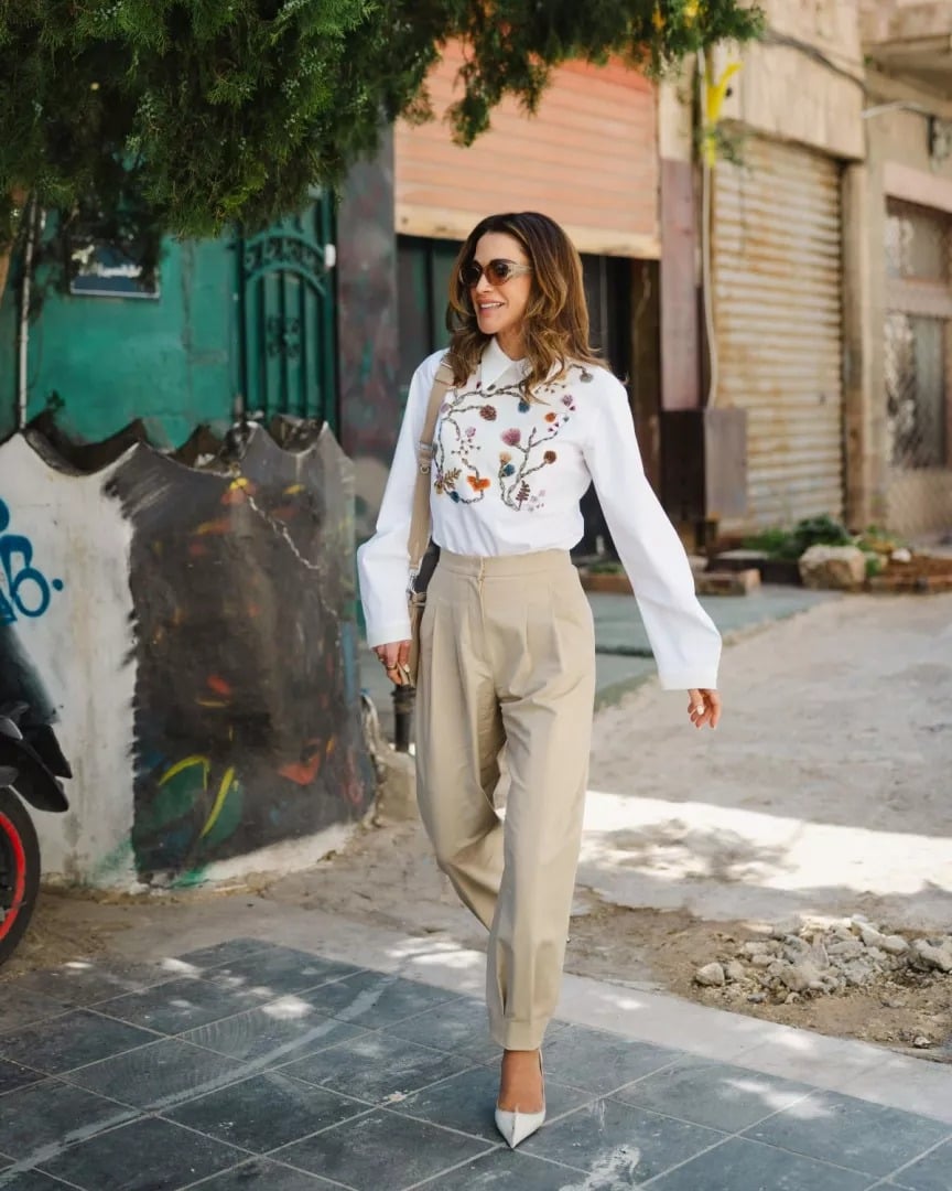 ظهرت الملكة بإطلالة تجمع بين الكلاسيكية العصرية والعملية، حيث اختارت قميصاً أبيض أنيقاً مزيّناً بتطريزات دقيقة بطابع نباتي، يُرجّح أن يكون من دار “ديور” Dior، وهو خيار يعكس ذوقها المعروف في انتقاء القطع الراقية ذات اللمسة الحِرفية. ونسّقت جلالتها القميص مع سروال عالي الخصر باللون البيج بقصة مستقيمة من توقيع “ماكس مارا” Max Mara، ما أضفى على الإطلالة طابعاً عملياً يناسب طبيعة الزيارة الميدانية.