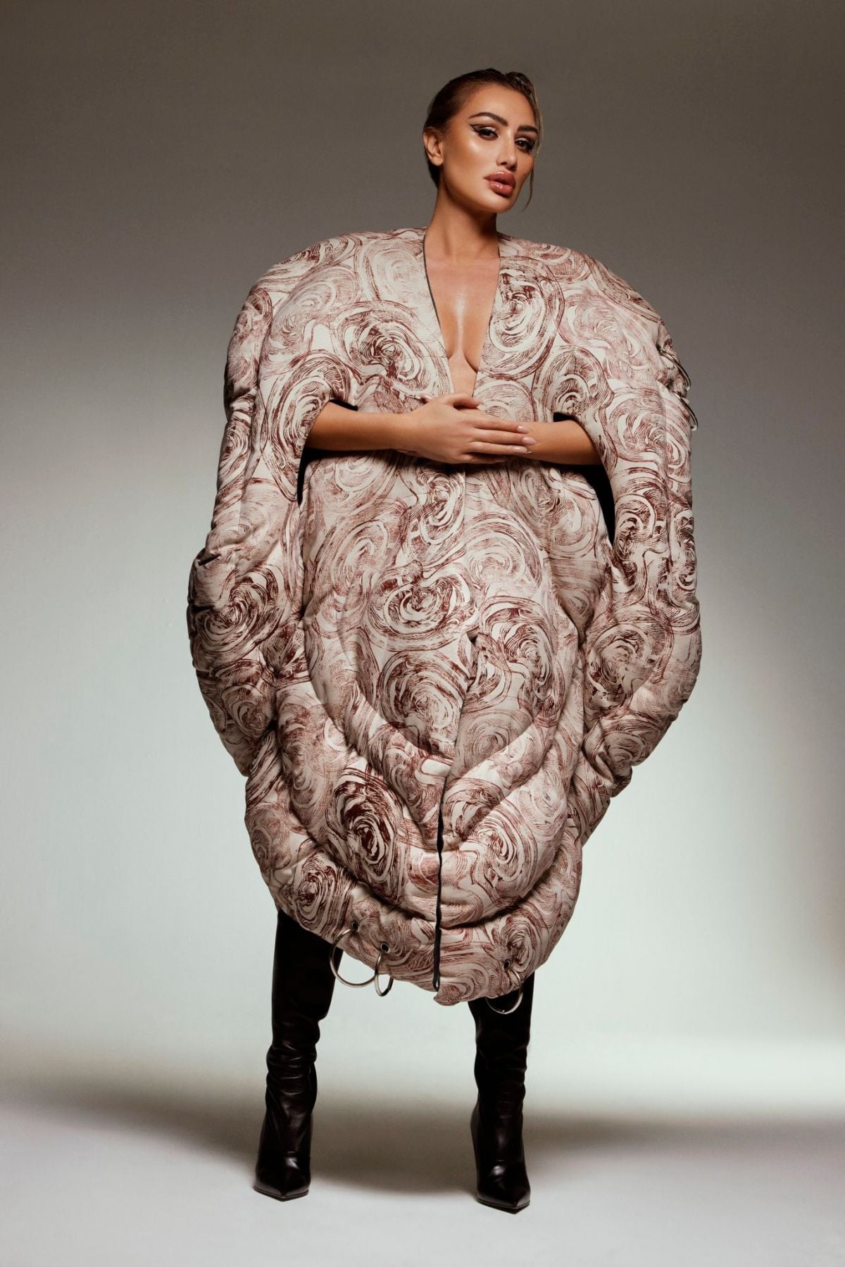 القماش جاء بنقشة تجريدية بدرجات البيج والبنّي، ما أضفى عمقاً بصرياً على التصميم، وجعل الإطلالة تبدو كلوحة متحركة. هذا النوع من الأزياء لا يهدف فقط إلى إبراز الجمال، بل إلى خلق حالة فنية متكاملة.